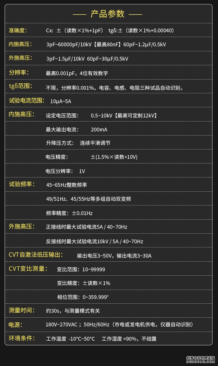tgδ范围:不限,分辨率0.001%,电容、电感、电阻三种试品自动识别。